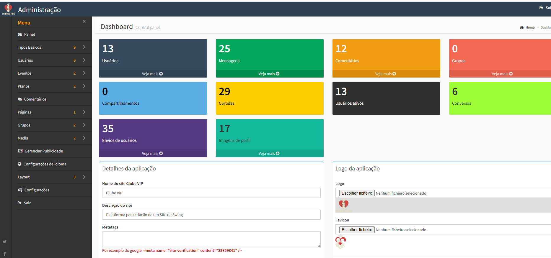 A Administração centraliza a operação do seu portal. Ao entrar, você vê um dashboard com cartões de métricas (Usuários, Mensagens, Comentários, Curtidas, Usuários Ativos, Compartilhamentos, Envios de usuários e Conversas), além de atalhos “Veja mais” para abrir as listas detalhadas. A área “Detalhes da aplicação” reúne nome/descrição do site, metatags e campos para inserir códigos JavaScript e CSS.