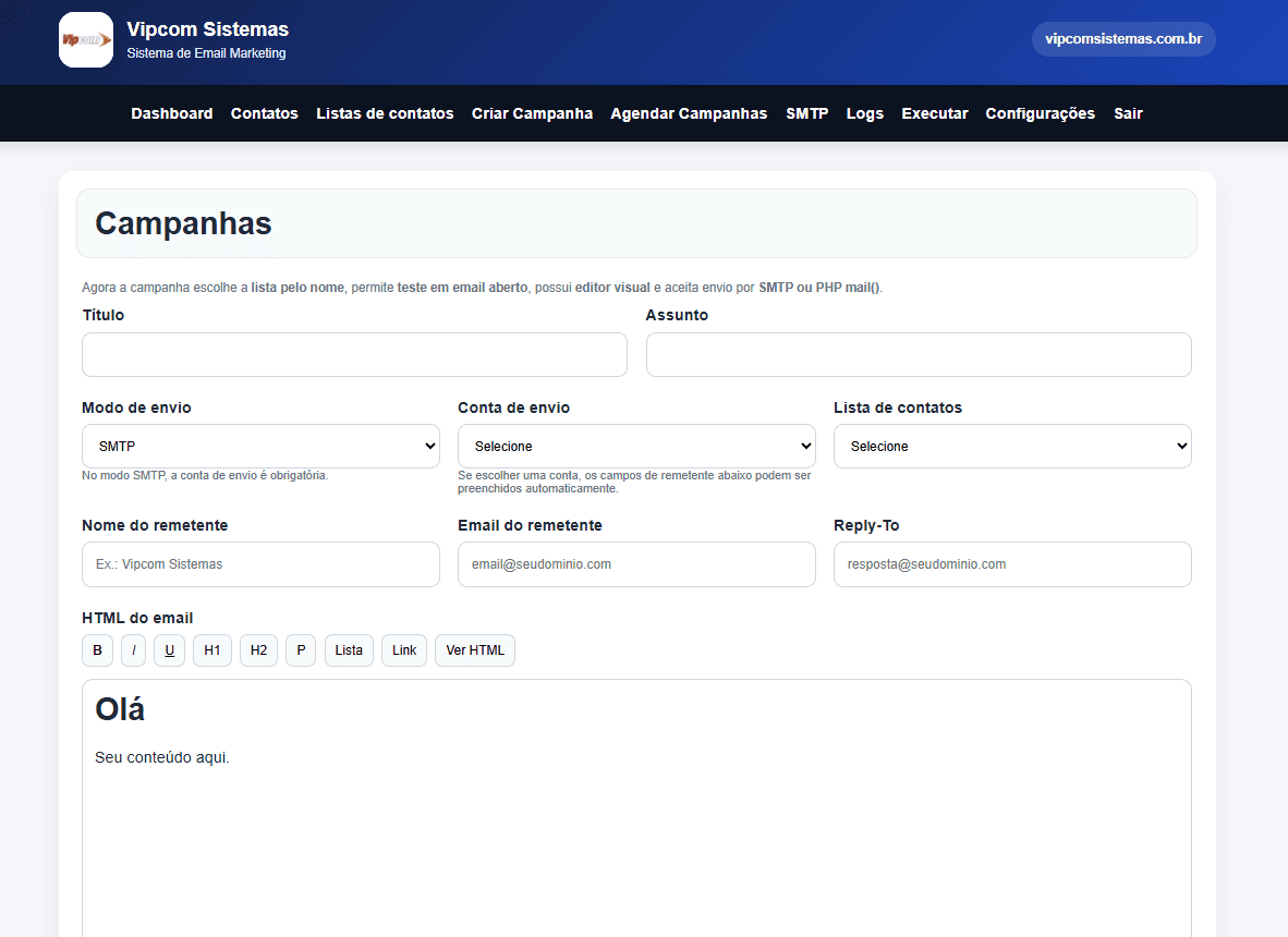 O sistema permite montar campanhas de email com título, assunto, remetente e conteúdo personalizado. Isso torna o processo muito mais rápido para quem precisa colocar uma campanha no ar sem perder tempo com etapas complicadas. Tudo fica centralizado em um único painel, com foco em produtividade e facilidade de uso.