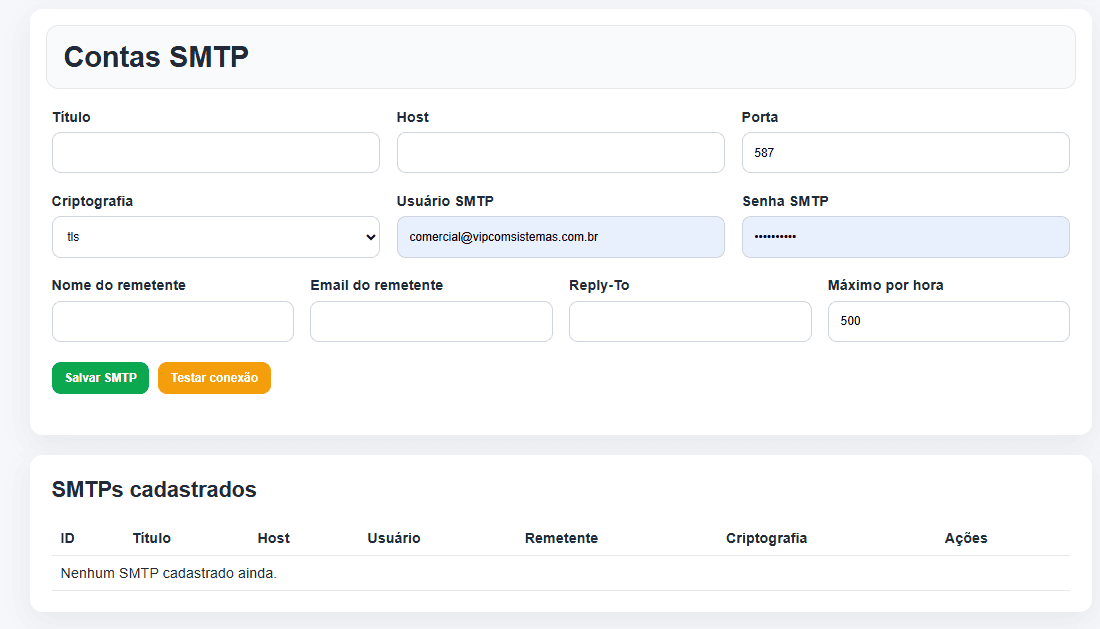 Teste de SMTP: valide a conexão antes de usar a conta em campanhas reais.