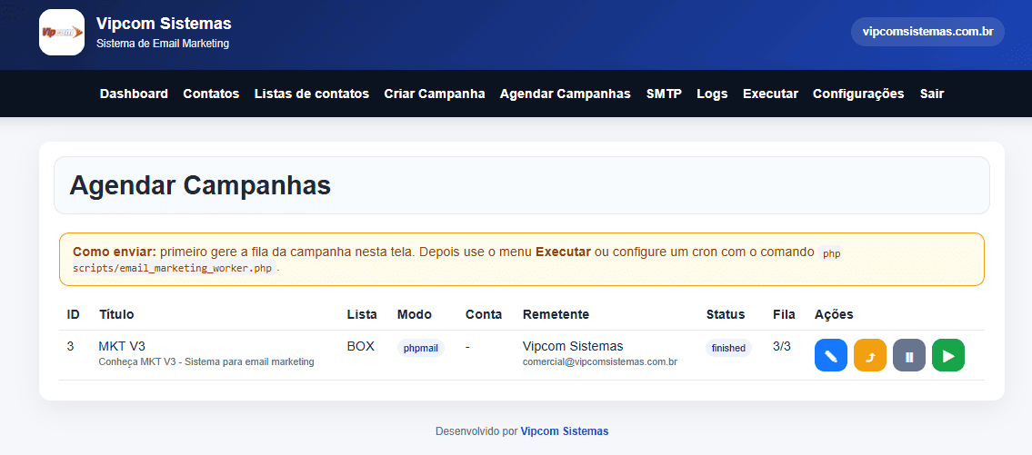 O sistema separa bem as etapas de criação, agendamento e execução. Com isso, sua empresa pode preparar campanhas com antecedência, organizar a fila e depois executar no momento ideal, mantendo um fluxo de trabalho mais profissional.